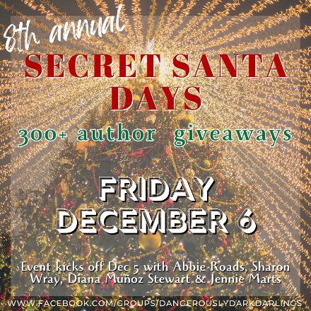 You all don’t want to miss this! Over 300 authors are saddling up for the 8th Annual Secret Santa Giveaway. I’ll be handing out goodies faster than an outlaw flees a posse… along with the other authors. Books, swag, and who knows what else could find their way into your stocking—get your keister over to Facebook and join the fun! Starts Friday December 6th. Winners announced Sunday, December 8th. www.facebook.com/groups/dangerouslydarkdarlings
